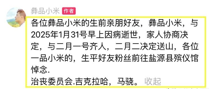 还有啊,“彝品小米”还是“白彝”姓氏“阿核惹恩”家族的第15代传人,这身份可不一般。他走了之后,朋友在视频账号上把他后事的情况发出来了。
